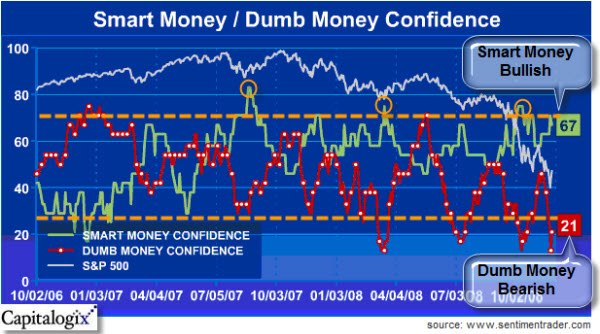SentimenTrader's Smart-Dumb Money indicator.  The Markets may still have some room to downside.  Yet, in contrast to the bearish bets made by small traders, recent Commitments of Traders reports (and other indicators) show that large commercial hedgers (aka the "Smart Money") are quite bullish.