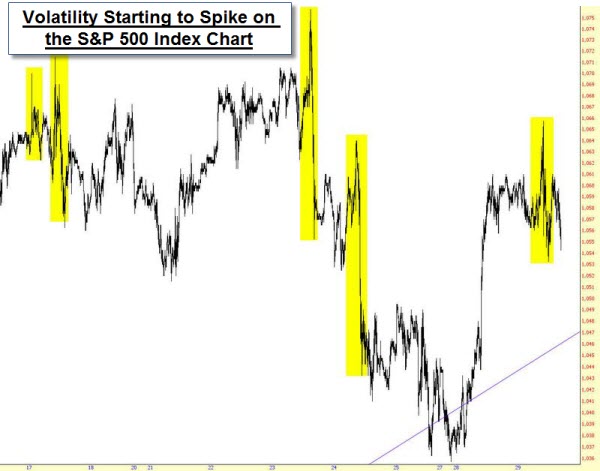 One thing tempering my confidence in the "buy the dip" strategy is that I noticed a lot more "mischief-bars" recently. These head-fake moves show-up on charts as jaggy spikes, and often shake-out weak holders … only to reverse sharply. Here is a chart of the S&P 500 from Tim Knight's Slope of Hope site. The yellow sections highlight areas where it is easy to see the spikes in volatility.