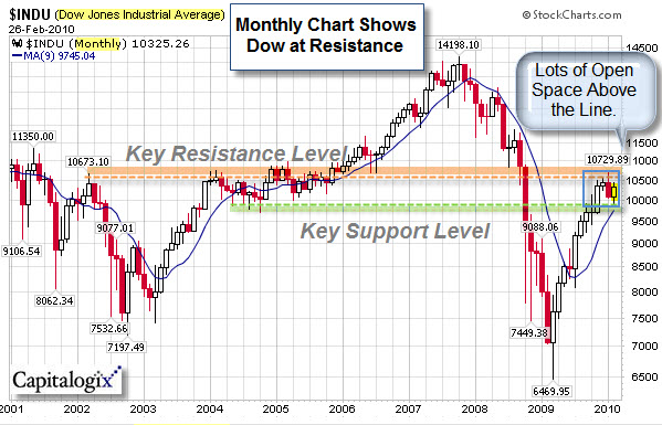 Sometimes simple is better.  What follows is a top-down look at the Dow Jones Industrial Average.  It starts with a monthly chart for the bigger picture.  That is followed by a weekly chart, and then by a daily chart.  In all three the key level is just above where we are.