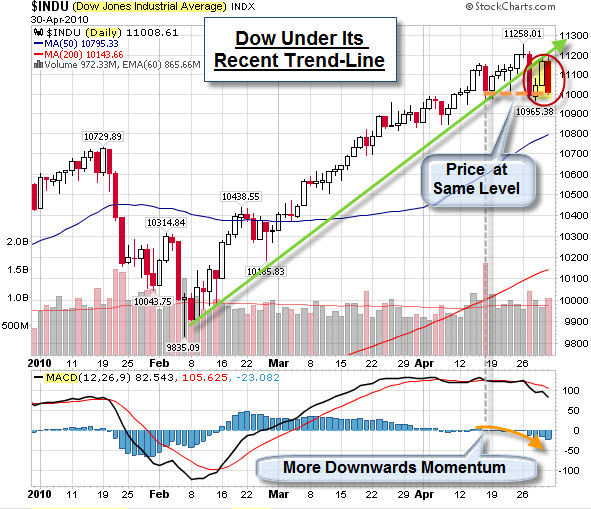 broke below its recent trend-line.  By itself, not a cause for major concern, just a key to notice.  The question is whether it can get back above that level, or will this be the start of a more meaningful correction?