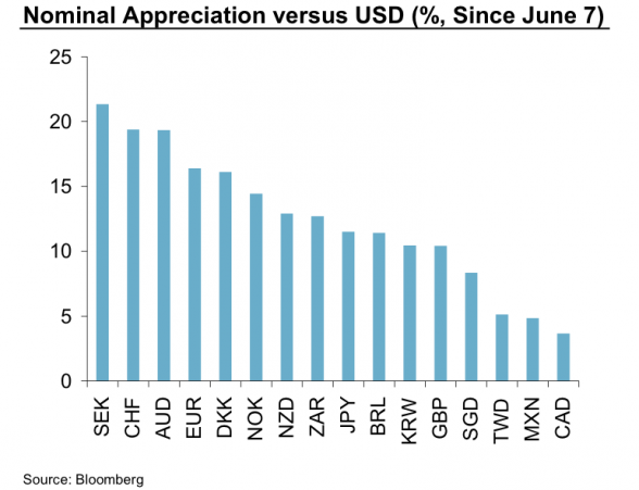 The big winner? The Swedish Krona. Note that the much-hyped yen is just in the middle of the pack.