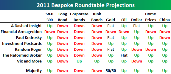 At the end of each year, the big financial media outlets typically conduct roundtables to get outlooks from key players in the financial markets. The Bespoke Roundtable asks twelve of the most popular financial blogs/websites the same 34 questions regarding their 2011 outlooks and their take on 2010. There are many insightful tidbits worth thinking about.
