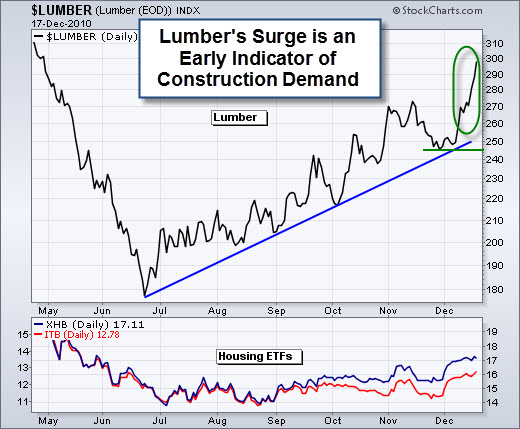 Lumber is surging. Moreover, the Homebuilders SPDR and the Home Construction iShares both are showing strength. This may show an increase in demand and often implies more construction.
