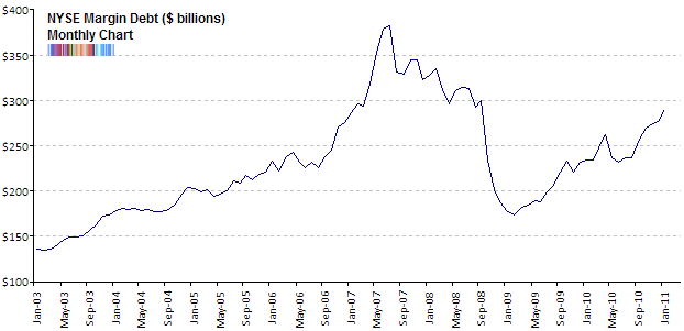 Every month, the New York Stock Exchange (NYSE) releases numbers showing how much money was borrowed on margin to buy stocks on the NYSE. As you can imagine, the amount of stock bought on margin is extremely large, but the total number fluctuates quite a bit based on how confident traders are. When stock traders are confident, they borrow more on margin. When stock traders are less confident, they borrow less on margin. Clearly traders are becoming more confident.
