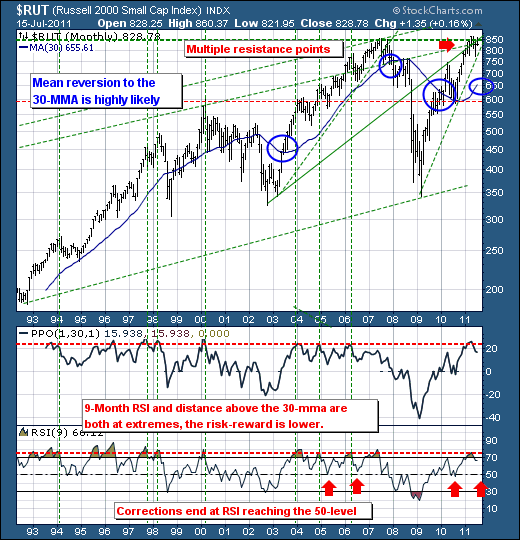 Richard Rhodes notes that the 9-month RSI hit above the 70-level, while the distance above the 30-month moving average rose to above 20%. In the past, these types of indicator readings have allowed for "mean reversion" lower processes to take place back to the 30-month moving average, while the RSI trades lower towards the 50-level.