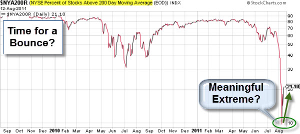 Last week, we got to a point where less than ten percent of NYSE stocks traded above their 200-day average. When the number of stocks that manage to stay above this moving average — a common measure of momentum — make a nasty two standard deviation move to the downside from the norm, it usually means an oversold market and a good time to buy.