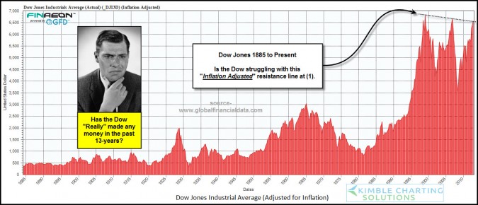 This chart displays the price of the Dow going all the way back to 1885 — and adjusts it for inflation. Clearly, if you do that, it is lower now than it was 13-years ago.