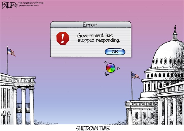 Funny cartoon by Nate Beeler.  Error: The Government has stopped responding.