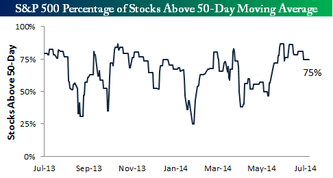 As shown below, 75% of the stocks in the S&P 500 are currently trading above their 50-day moving averages.