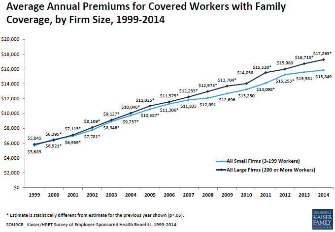 Are premiums rising faster for small employers? No, actually, the opposite is true. For companies with 200 workers or more, average 2014 premiums were $17,265, or 3.3 percent higher than in 2013. At companies with 3 to 199 workers, annual premiums in 2014 averaged $15,849 — 1.7 percent more than in 2013, when average premiums were 2.2 percent higher than in 2012.