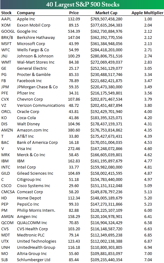Below is a list of the 40 largest stocks in the S&P 500. For each stock, Bespoke highlights its "Apple Multiplier", or the amount that each company would have to multiply by to reach the size of Apple.