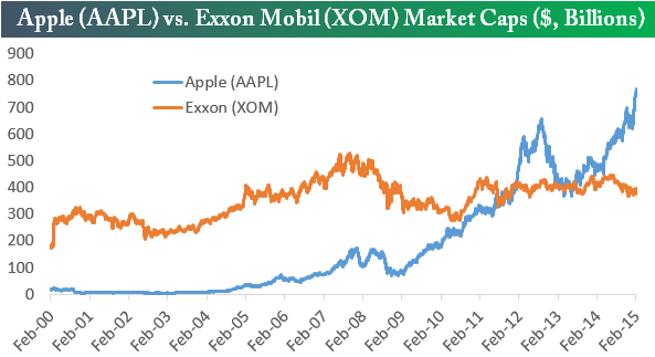 Moreover, Apple is also now more than twice as large as the second largest company (Exxon Mobil) in the world. Below is a comparison of the market caps for Apple and Exxon going back to 2000.