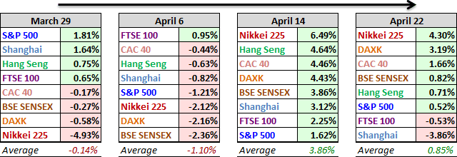The tables below provide a concise overview of performance comparisons over the past four weeks for these eight major indexes. The average for each week also is included to evaluate the performance of a specific index relative to the overall mean and better understand weekly volatility.