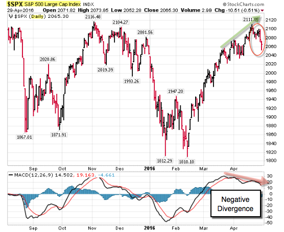 Here is a chart of the S&P 500 Index showing the recent thrust higher and recent correction. In addition, notice the negative divergence (where recent price highs happened with lower momentum). This is often taken as an early topping indicator (or sign of underlying weakness).