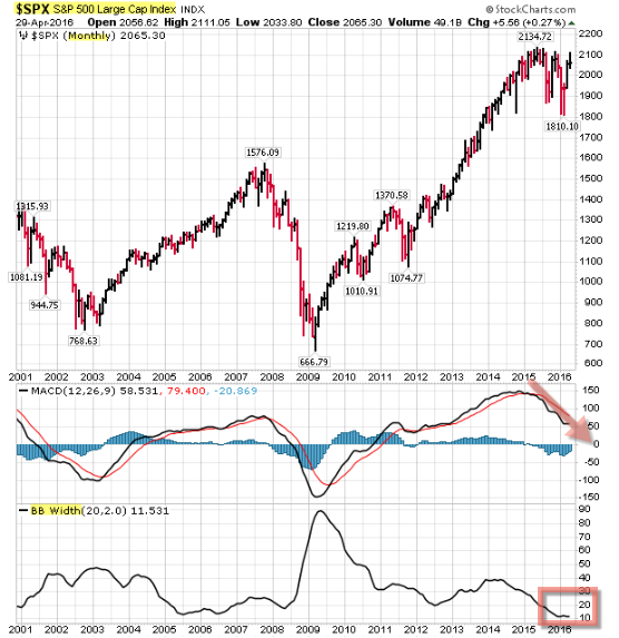 Meanwhile, the monthly chart shows weakness too (with negative divergences and a classic volatility squeeze).