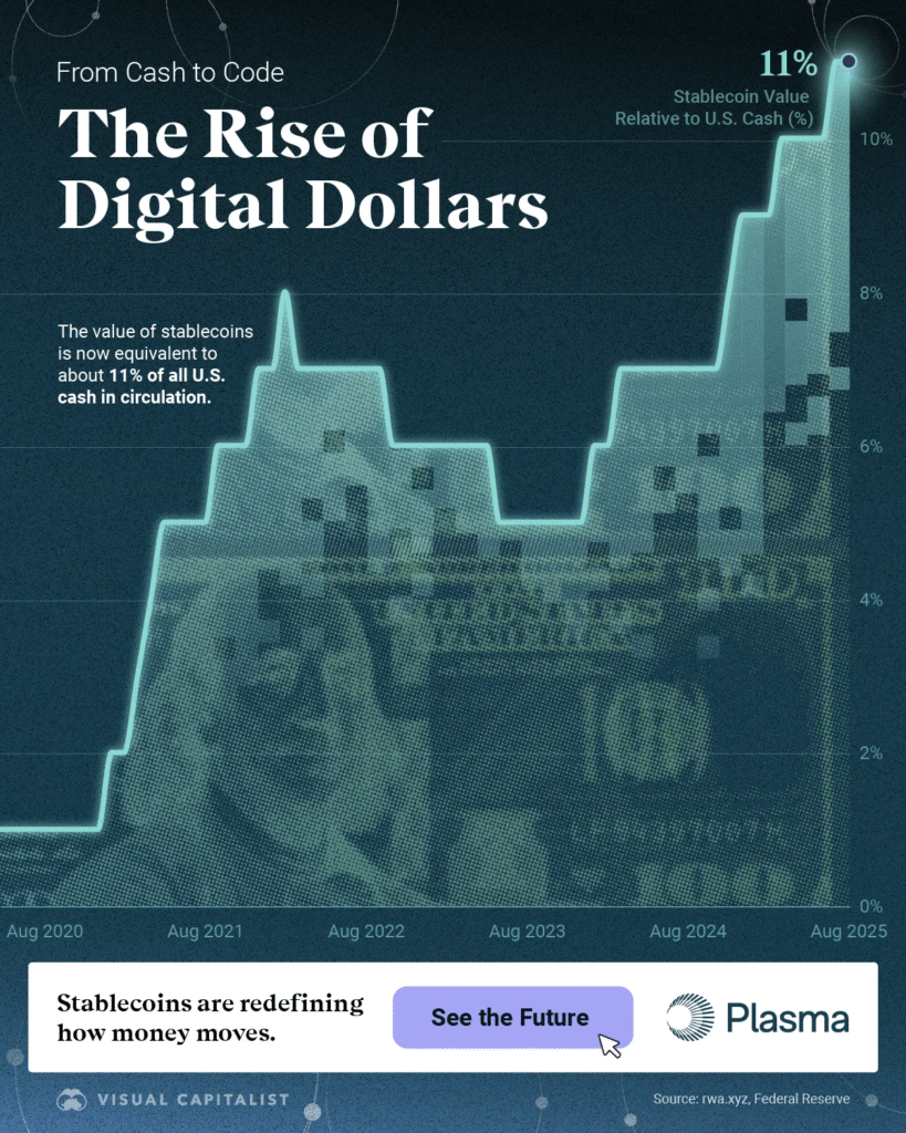 Comparing the market value of stablecoins to the amount of U.S. currency in circulation (bills and coins) shows that stablecoins now make up about 11% of that total. That’s a remarkable jump in just five years.