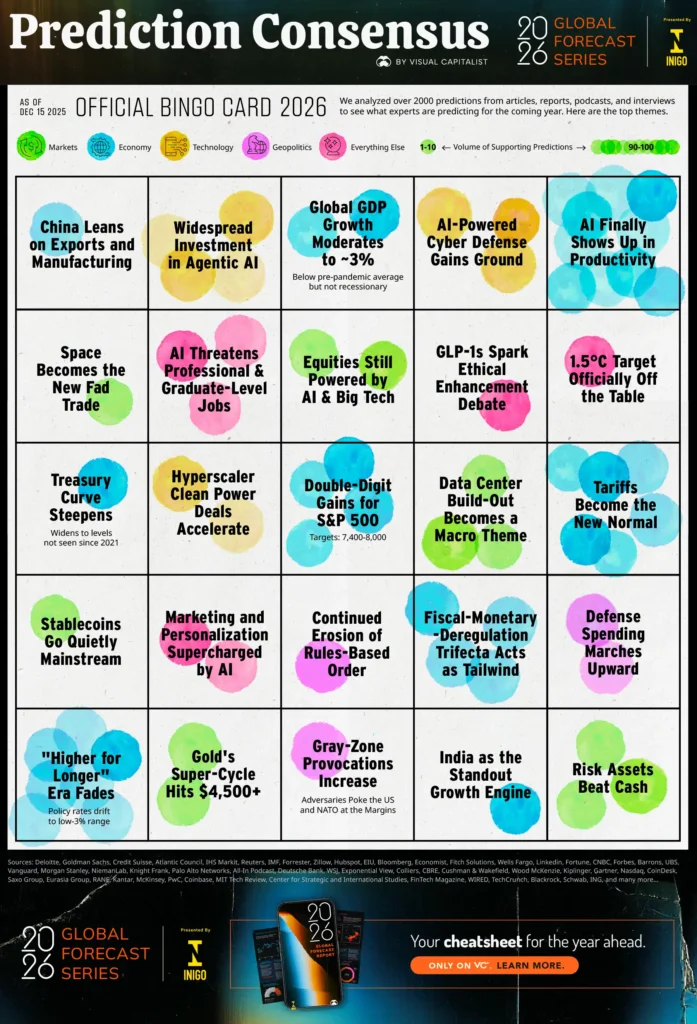 This ‘bingo card’ shows where institutional predictions cluster — and where they are most likely to be wrong. Taken together, it is less a forecast and more a map of the assumptions currently shaping capital flows and corporate decisions.