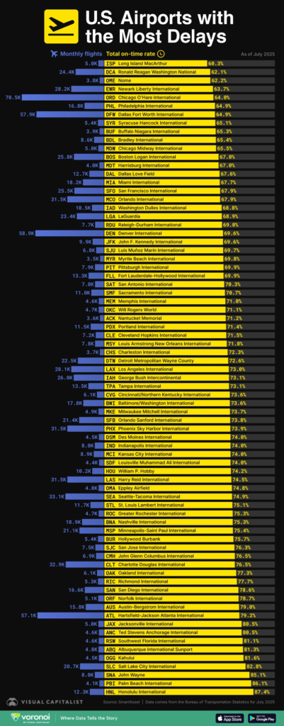 Large, busy airports consistently rank lower, reflecting the pressure of urban airspace, complex operations, and seasonal weather patterns. Meanwhile, airports in warmer regions, especially in the South and along the coasts, tend to encounter fewer disruptions.