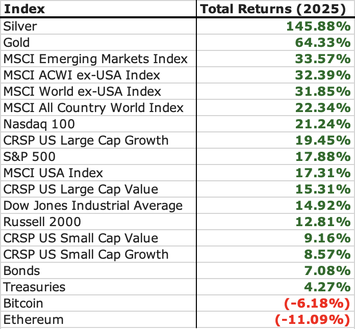 None of this guarantees how 2026 will play out. It does suggest a few things to watch: whether the strength in metals persists, whether international markets can build on their leadership, and whether crypto’s drawdown turns into a reset or a renewed rally. It also reinforces a familiar lesson: diversified, rules‑based portfolios can thrive even when leadership rotates (did you read last week’s article?)